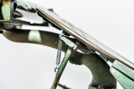 Ein Schild verrät den Hersteller auf dem Farbwerk: „Gebr. Heidsieck aus Kamenz (Sachsen)“. Das Besondere an diesem Boston Tiegel ist, dass er drei Walzen hat. Mit der obersten holt er sich immer wieder neue Farbe aus dem Farbwerk und behält damit einen sehr gleichmäßigen Farbauftrag. Nachdem der Tiegel frisch geölt und alles einmal mit einem Pinsel vorsichtig entstaubt wurde, begann ich mit dem ersten Druck. Frösche (engl. Henry Gauge-Pins) hatte ich bereits. Ich bastelte mir eine gerasterte Anlage (auf dieser wird das Papier angelegt) in Punkt-System, damit ich diese auch leichter unterwegs ausrichten kann.